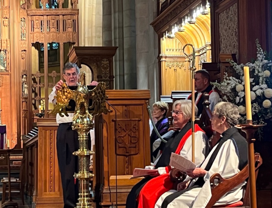 Bishop Keith stood at the lectern and reflected that 30 years on was an appropriate time to ‘recognise the blessings the church has received’ from the ordination of women. He then spoke candidly about the struggle, and the effect it had on his sense of episcopal leadership. The issue he said gave him some of the ‘most anxious and demanding of his years’ in the episcopate. He spoke of the ‘masculinity that has dominated the church’s governance and ministry’, and acknowledged ‘the pain and suffering that was the lot of many of the pioneers’. (You can see his talk on the Cathedral’s youtube channel, ‘Choral Evensong 4 Dec 2022’).
